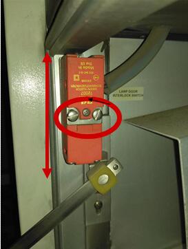 5、 當(dāng)M2信息消除后,我們要把燈盒門關(guān)閉,一定要確保關(guān)閉,由于燈管啟動(dòng)電壓是800V,所以要確保燈盒門關(guān)閉好。運(yùn)行儀器,看儀器是否可以點(diǎn)亮燈管。如果能,則表明故障是由于門鎖開關(guān)接觸不良引起的,我們需要調(diào)整門鎖開關(guān)的位置,使到其可以接觸良好,通過(guò)擰松右圖中的螺絲,就可以上下移動(dòng)門鎖開關(guān),不斷地調(diào)整位置,就可以讓門鎖開關(guān)接觸好。PS:記住在調(diào)整之前要先把之前擰松的四顆螺絲擰緊,以便讓門鎖開關(guān)生效。